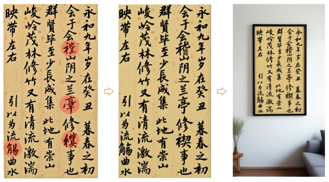 在继承Qwen-Image优势的基础上,Qwen-Image-Edit 的文本渲染能力领先行业水平。无论是英文还是中文,它都能实现高保真的文本编辑(支持图像中添加、删除或修改文本的同时保留原有字体、大小和风格)。例如,在下面这件艺术品中,有几个汉字存在生成错误。我们可以借助 Qwen-Image-Edit 逐步纠正,这种精准的文本编辑能力使其在广告设计、品牌宣传和内容创作中具有巨大潜力。