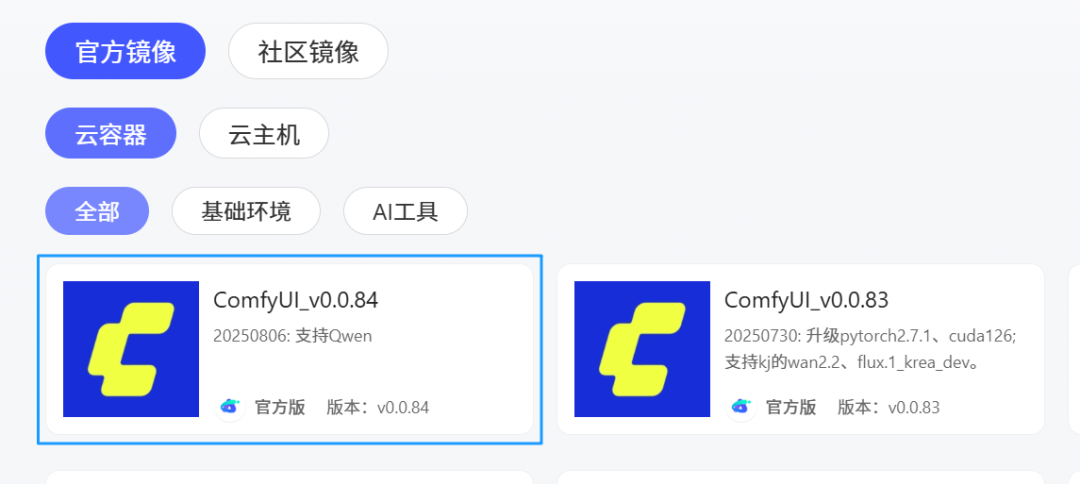 1)选择万象城AWC算力云 - 镜像中心提供的“ComfyUl_v0.0.84”快速创建实例。