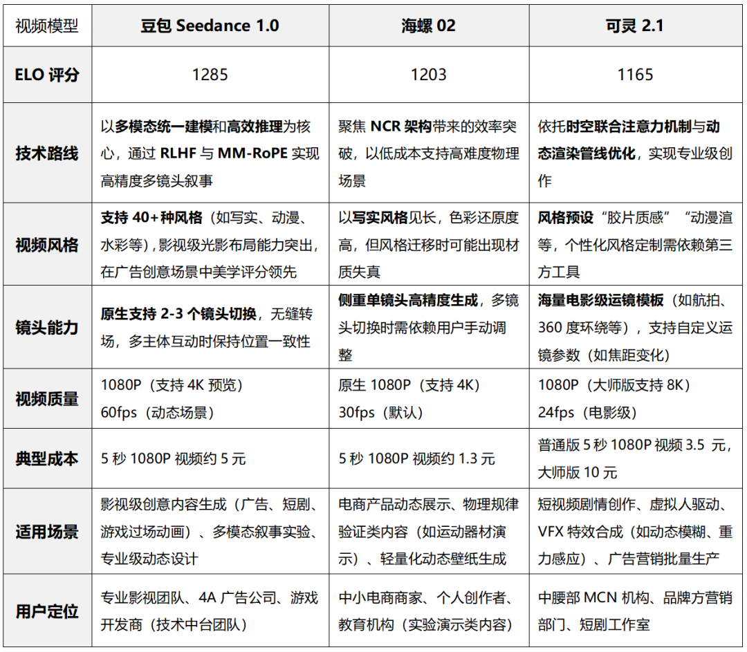 结合榜单数据,我们在梳理豆包 Seedance 1.0、海螺 02、可灵 2.1 三款模型的详细参数后,更清晰地看到三者在核心技术路径、能力侧重上的差异化优势。