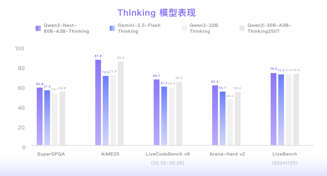 基于Qwen3新一代思考开源模型,相较上一版本Qwen3-235B-A22B-Thinking-2507指令遵循能力有提升、模型总结回复更加精简。其在数学推理评测中以 87.8 分全面超越了 Gemini2.5-Flash-Thinking,而达到如此高水平的模型性能,仅需激活 Qwen3-Next 总参数 80B 中的 3B。