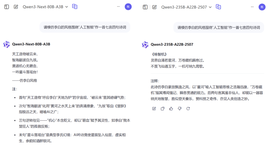 在文本类生成任务中,我们让模型模仿李白的风格围绕“人工智能”作一首七言四句诗词。从生成结果上看,两首诗皆以李白式的豪放浪漫为底色,左诗借“星斗落瑶台”的奇幻想象,右诗凭“不羡飞仙纳九霄”的傲岸豪情,把 AI科技质感融入唐诗韵律,读起来既有古人气韵,又能感觉到 AI的“浪漫狂劲儿”。