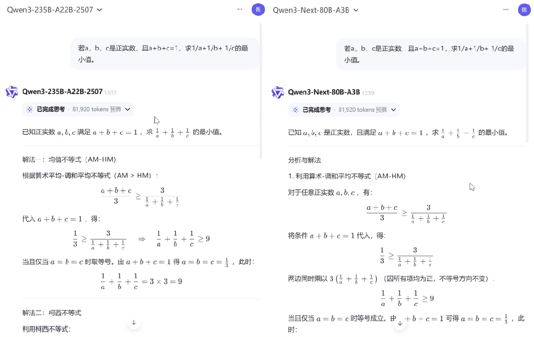 在应对清华北大奥数题目时,Qwen3-Next-80B-A3B(Thinking)与上一代 Qwen3-235B-A22B-Thinking-2507 的表现旗鼓相当,尽管二者解题思路存在差异,但都清晰推导解题过程并给出了正确答案。