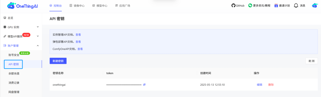 步骤二:获取开发者密钥。登录OneThingAI平台,进入账户管理,选择「API密钥」自主创建。(顺利获得平台密钥可与第三方建立通信,拉取平台给予的模型API列表)