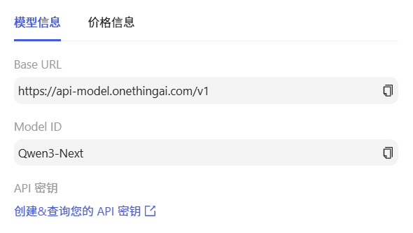 步骤三:OneThingAI平台给予curl、Python、Node.js三种技术方案,以便快速接入模型Qwen3-Next,满足多样化开发场景及开发者使用习惯。
