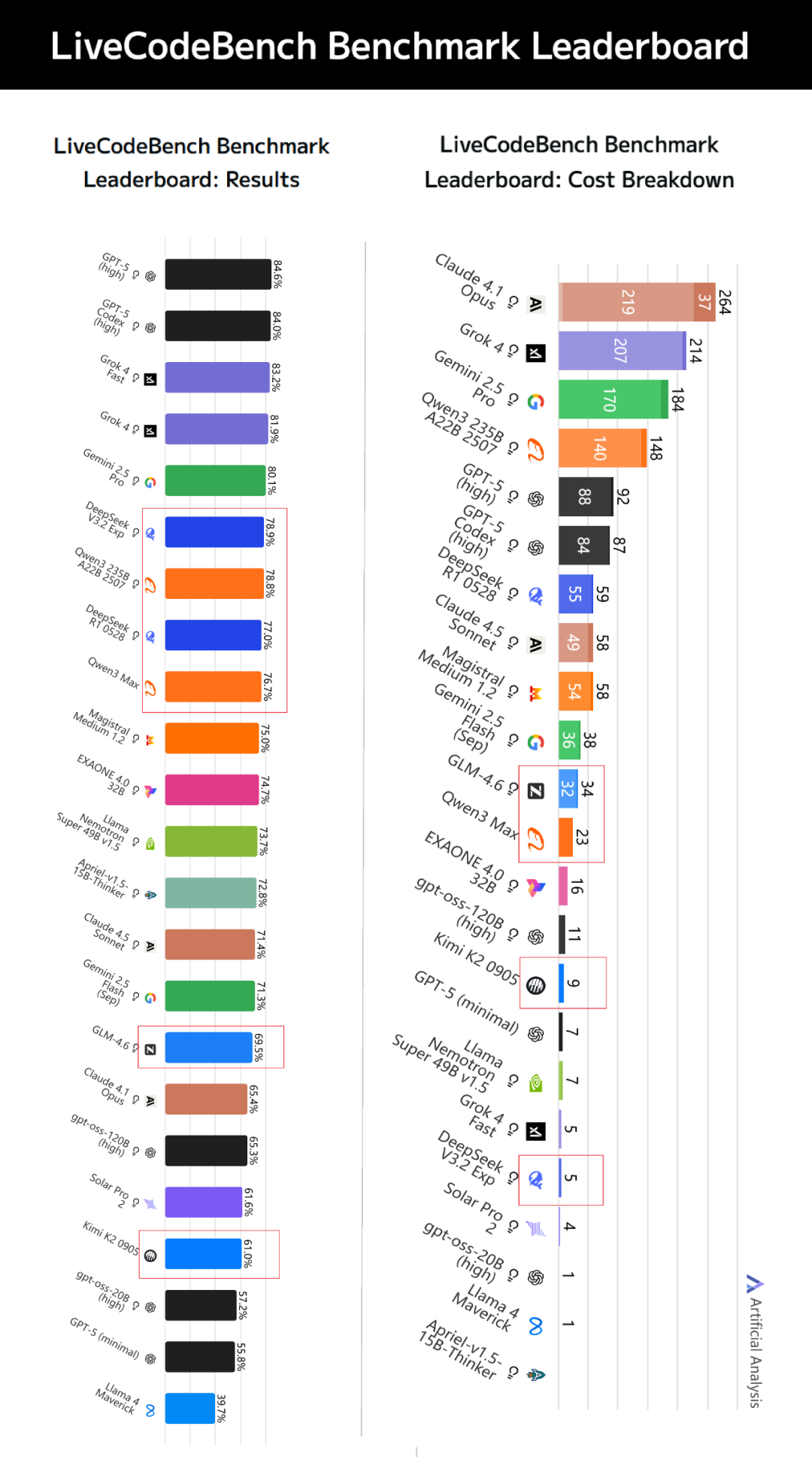 据 LiveCodeBench 基准测评数据显示:国产大模型代表“深度求索 DeepSeek 、通义千问 Qwen 3、智谱 GLM、月之暗面 Kimi K2 ”等系列,AI 编程性能已接近 GPT - 5(high)、Grok 4 等国际顶尖模型水平,且成本控制优势显著(如DeepSeek V3.2 Exp 的评估成本仅为 5,不到 Claude 4 等国际模型的2%),彰显了国产大模型在编程领域的硬核实力与经济效益。