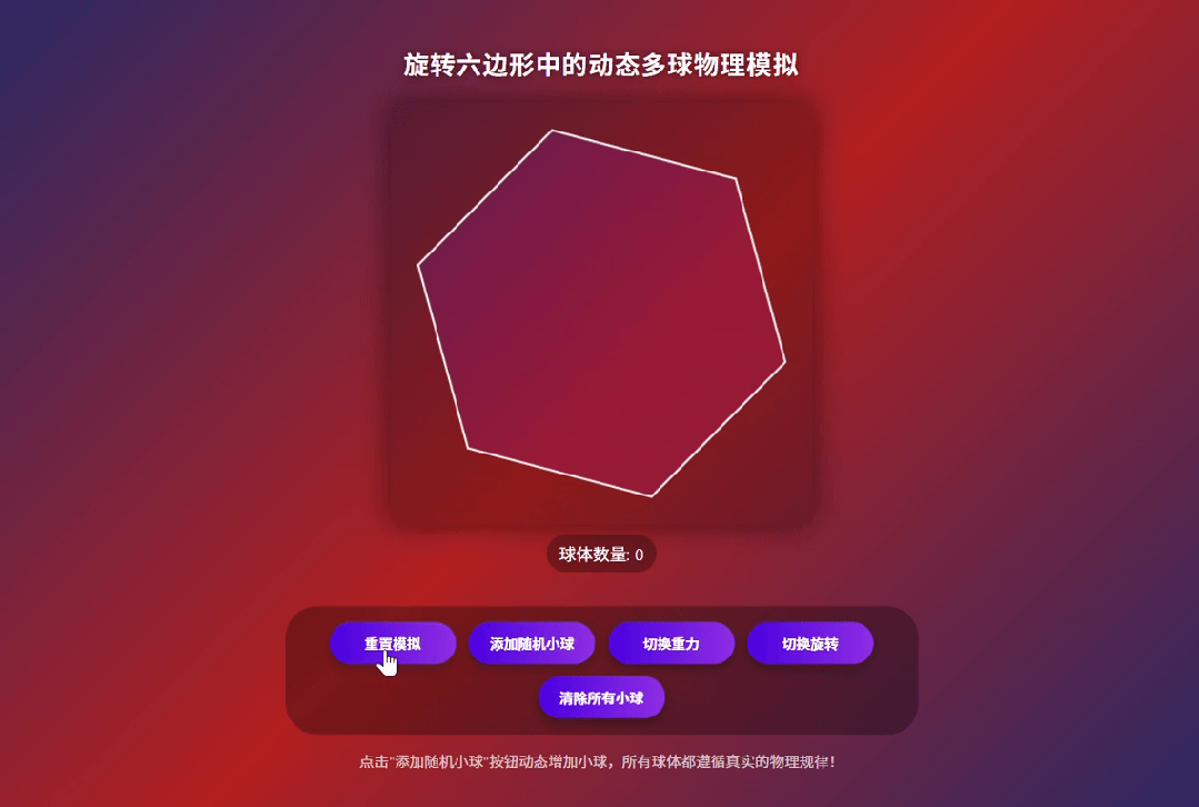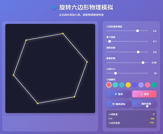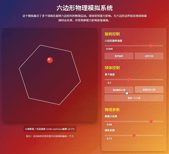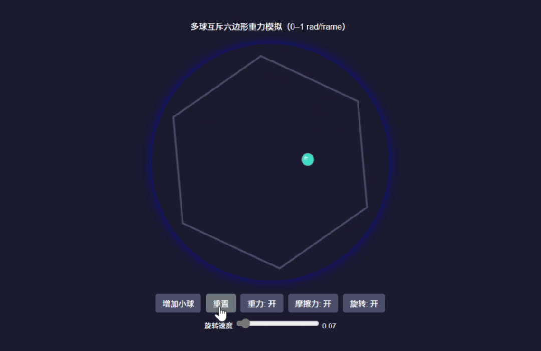 在旋转六边形内进行小球弹力、重力的物理模拟测试中,以上模型都顺利完成了任务。其中,智谱 GLM-4.6、DeepSeek V3.2 Exp 为用户给予了更多详细的参数设置;而 Qwen3 Max、Kimi K2 0905 则继续保持极简风格,快速完成任务。