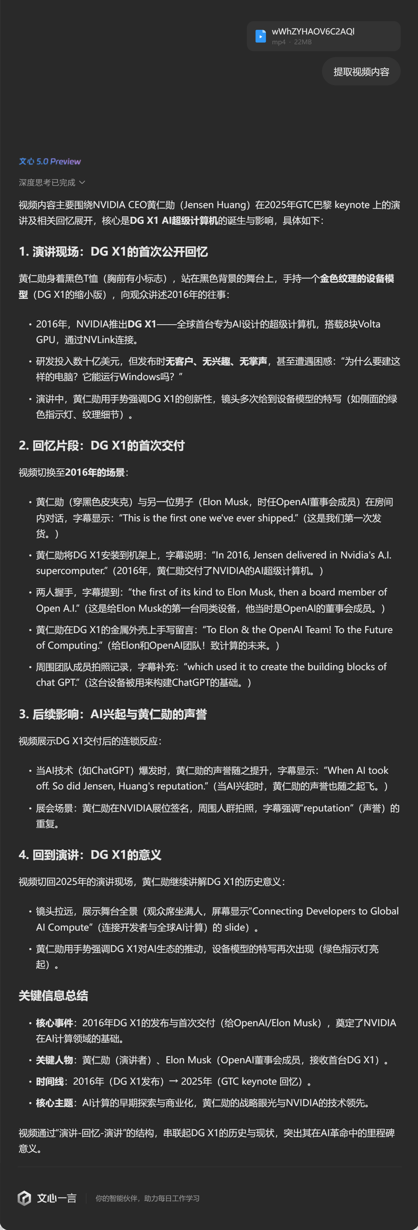 我们上传一段英伟达首席执行官黄仁勋在介绍 DGX Spark 时回忆初代人工智能超级计算机 DGX-1 的视频片段,看文心 5.0 在提取视频内容时会不会混淆。要实现这一点,需要 AI 对视频进行多模态解析,包括语音识别、内容提取,并生成一份结构化的内容摘要。