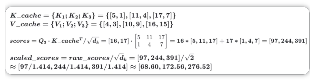 现在可以读取 K_cache,V_cache 用于计算 X₃ 输入后的 attention score 了,不用再重复计算 X₁、X₂的 QKV,为了简化表达我们先更新 cache,然后再进行计算。