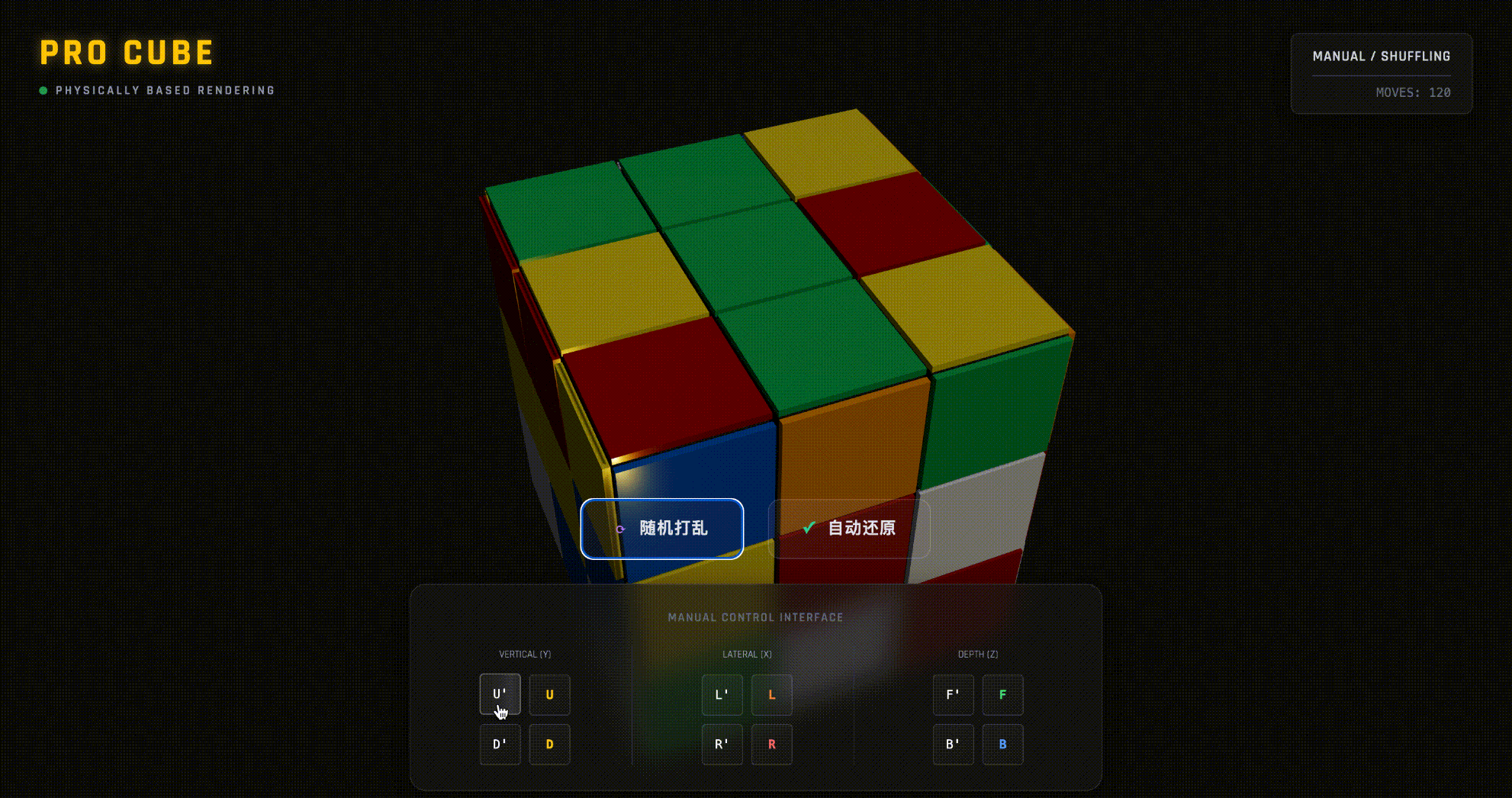 示例:构建一个3d纹理的rubix立方体,有一个按钮可以洗牌立方体,另一个按钮可自动解决谜题。此外,给予允许用户使用多个按钮手动求解多维数据集的控件。立方体还应支持放大和缩小。