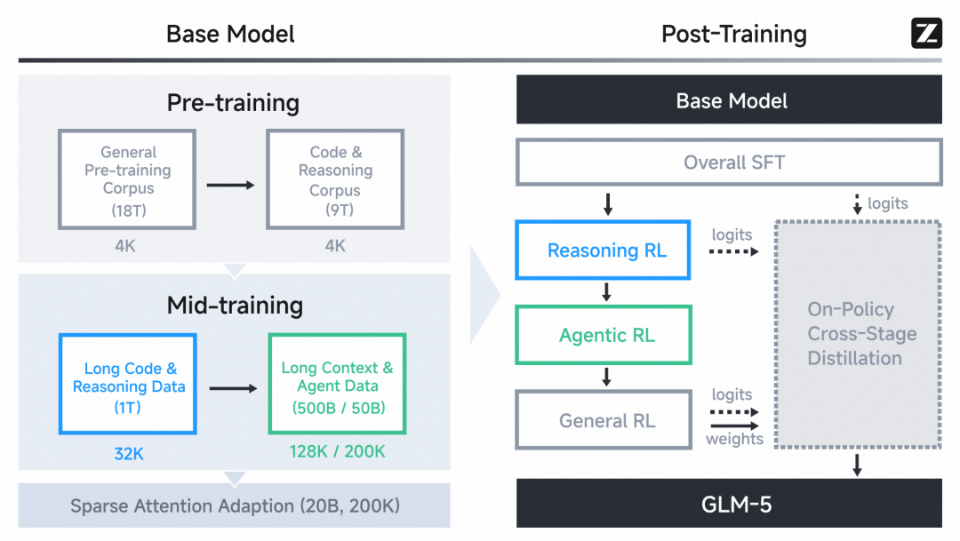 替代传统 MoE,GLM-5 按 Token 重要性动态分配算力,在保持长上下文能力的同时大幅降本,支撑模型从 355B(激活 32B)扩展至 744B(激活 40B),预训练数据从 23T 提升至 28.5T,显著提升了模型的通用智能水平。